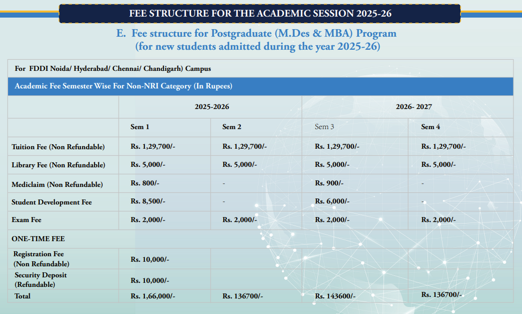 Earlier, M.Des Fashion Design and Technology fees at FDDI Noida was ₹ 5.83 Lakhs (in 2024) for the entire course duration. This shows that the fee has remained unchanged since 2024.