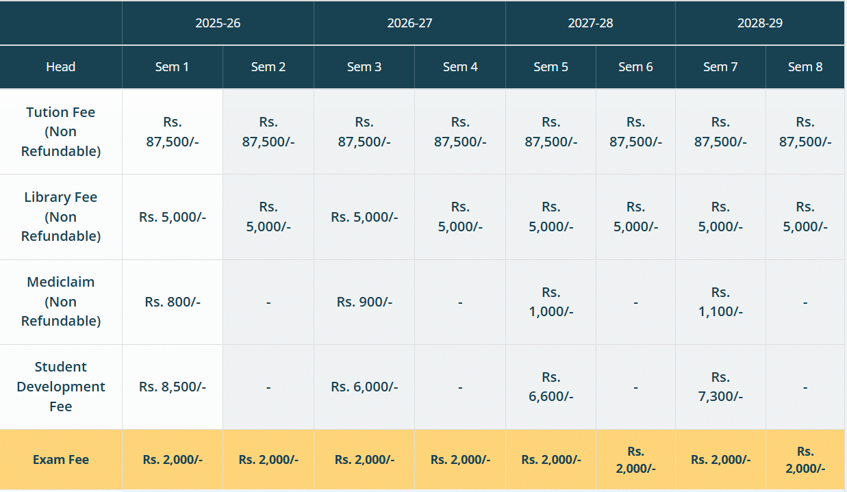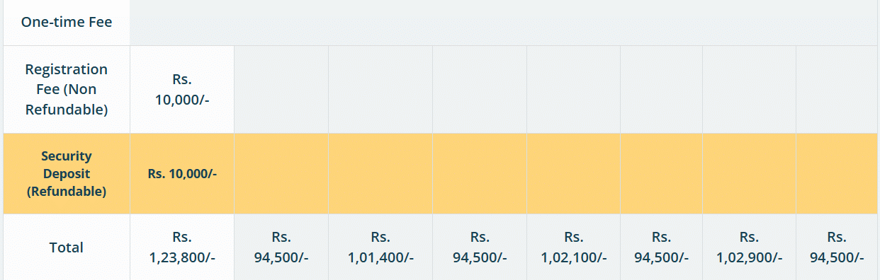- This includes a total tuition fee of ₹ 7 Lakhs, Caution Fees of ₹ 10,000, Other Fees of ₹ 82,200.