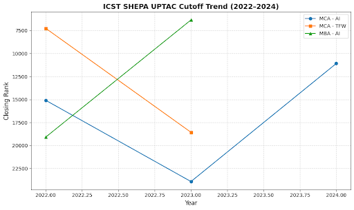 Based on previous trends, the UPTAC cutoff for MCA at ICST SHEPA is expected to decrease in 2025, suggesting that admissions may become more competitive. Candidates aiming for MCA should target a better rank than in previous years to secure admission. For MBA, the cutoff has also dropped significantly over the years, indicating increased demand for the program.