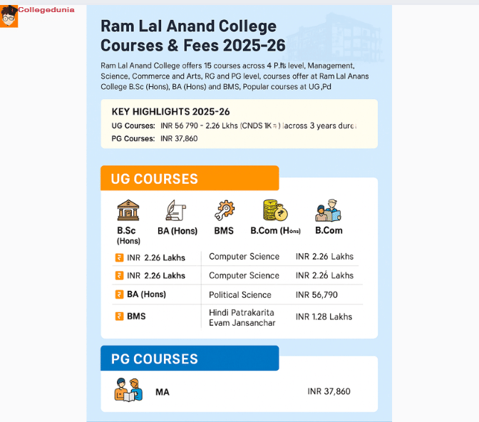 - Ram Lal Anand College Fees 2025-2026 is INR 29,630 - 2.26 Lakhs across all offered courses. The UG Fees for Ram Lal Anand College is INR 56,790 - 2.26 Lakhs. Ram Lal Anand College PG Fees is INR 37,860.