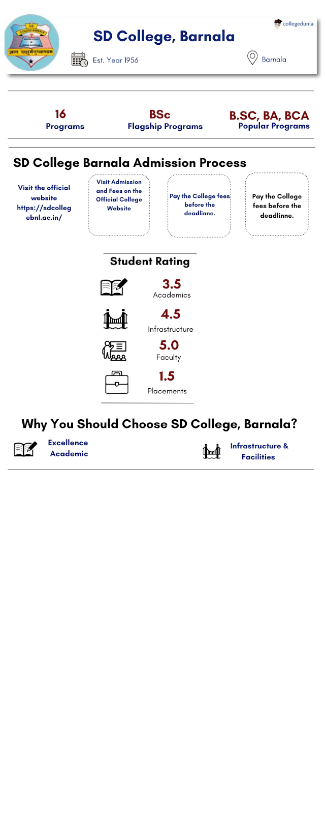 S D College Barnala offers a range of UG, PG and PG Diploma courses. It offers a BSc in Physical and Life Sciences as its most popular course. A candidate with a minimum qualification of 10+2 in PCB (For Medical), and 10+2 in PCM (For Non-Medical) is eligible to apply for the BSc program, and the selection is merit-based.