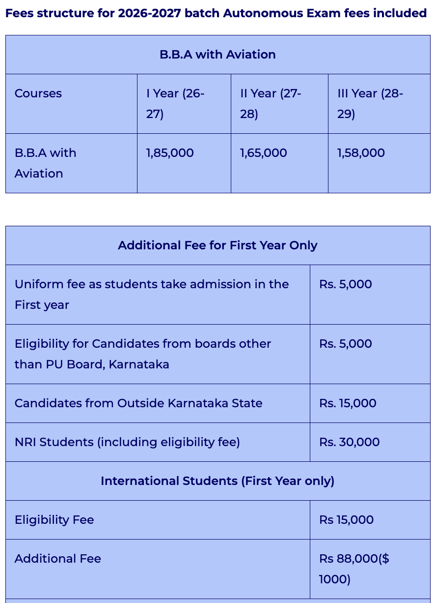 Earlier, BBA Aviation fees at St. Claret College Bangalore was ₹ 4.65 Lakhs (in 2025) for the entire course duration. This shows a fee increase of ₹ 48,000 over the year.