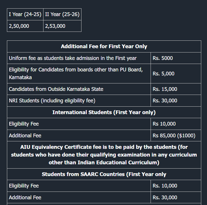 The standard fee for the MBA program is four lakh. However, students who qualify through the PGCET examinations can benefit from a scholarship, which significantly reduces the fee to one lakh.