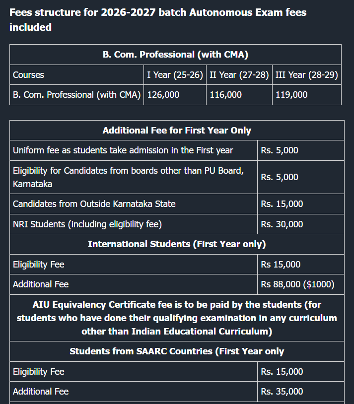 03 Dec, 2025 St. Claret College Bangalore B.Com Certified Management Accounting Fee Structure 2026-27 has been released. The total academic fee is ₹ 3.66 Lakhs.