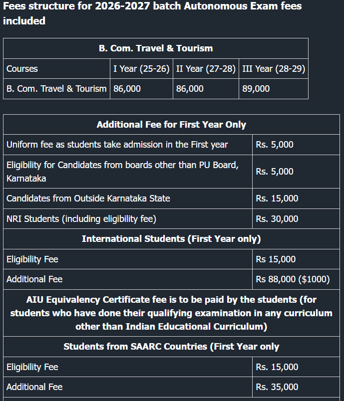 The Travel and Tourism course at this college offers a comprehensive learning experience, with the option to concurrently pursue a B.Com degree. The admission process includes a personal interview to gauge candidates' interest and motivation for enrolling. The faculty is generally well-qualified and supportive, fostering student growth despite a few teachers being less favorable. The fee structure is strict and considered high, though not exorbitant, with provisions for fee reductions for low-income students and high performers.