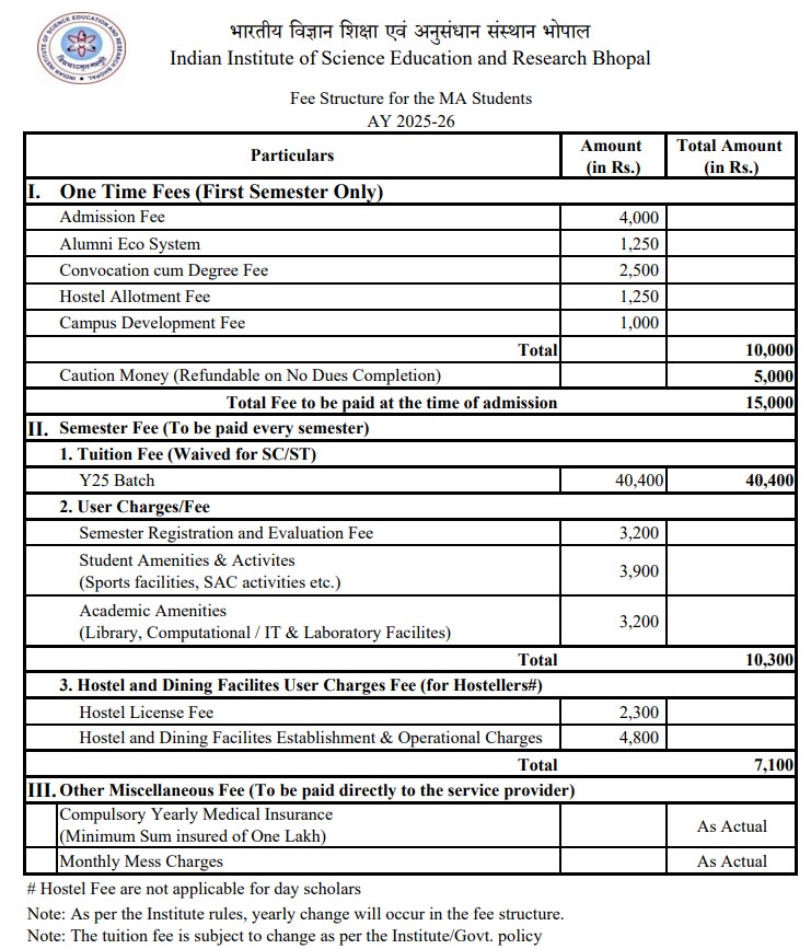 IISER Bhopal M.A Liberal Arts fees 2025 is ₹ 2.17 Lakhs for the entire course duration.