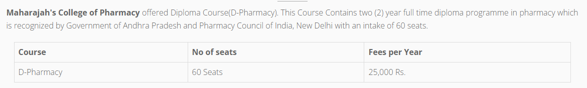 Maharajah's College of Pharmacy Vizianagaram offers a total of 60 seats for D.Pharm Pharmacy.
