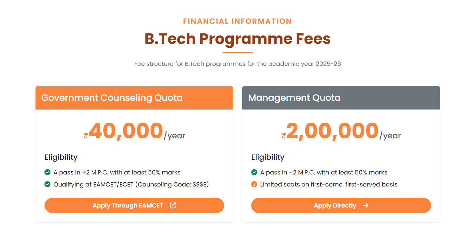 Earlier, B.Tech Mechanical Engineering fees at Sanskrithi School of Engineering Puttaparthy was ₹ 1.6 Lakhs (in 2024) for the entire course duration. This shows that the fee has remained unchanged since 2024.