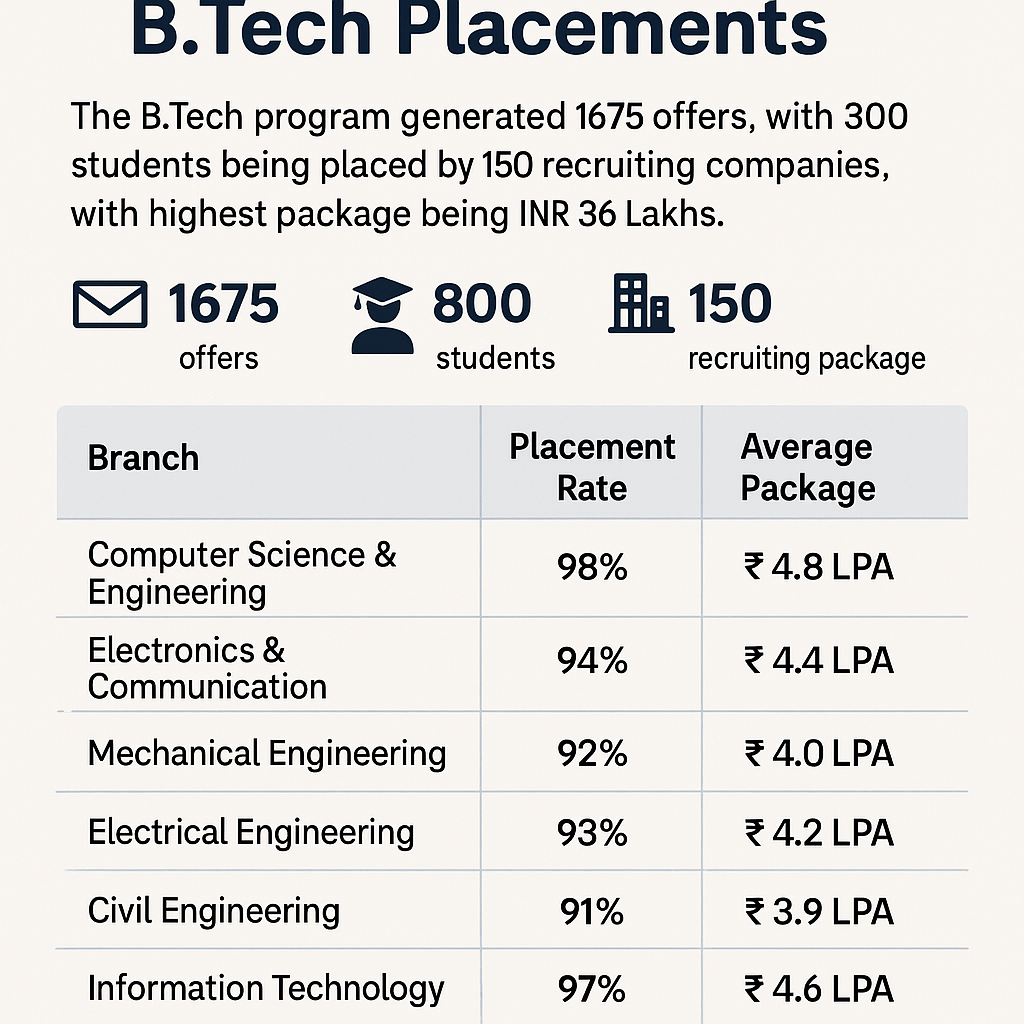 B.Tech Placements: The B.Tech program generated 1675 offers, with 800 students being placed by 150 recruiting companies, with the highest package being INR 36 Lakhs.