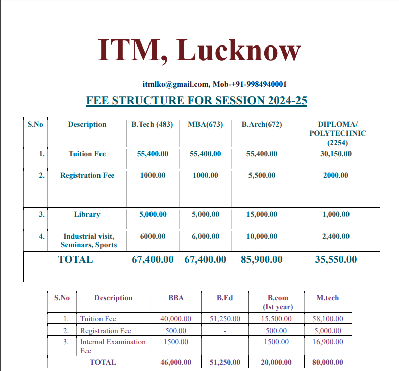 | Institute of Technology & Management Lucknow | ₹ 1.25 Lakhs |