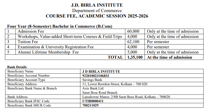 Find detailed JD Birla Institute Kolkata B.Com {Hons.} Finance fees, eligibility, admission dates, cutoff and ranking below.