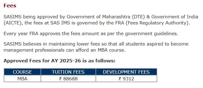 SAS Institute of Management Studies Mumbai M.M.S Systems is offered as 2 Years Full Time program, with total intake of 180 seats. The minimum eligibility criteria for M.M.S is Graduation + CAT. The total fees for SAS Institute of Management Studies Mumbai M.M.S Systems in 2025 is ₹ 1.96 Lakhs for the complete course duration. Earlier, the fees in 2022 - 2023 for M.M.S Systems was ₹ 1.5 Lakhs.