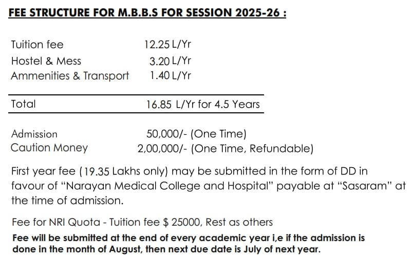 Earlier, MBBS fees at Narayan Medical College & Hospital Rohtas was ₹ 54.4 Lakhs (in 2023) for the entire course duration. This shows a fee increase of ₹ 9.35 Lakhs over the year.