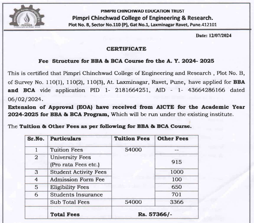Pimpri Chinchwad College of Engineering and Research Ravet BBA Fee has not been released yet. For reference you can check the previous year academic fees in the section below.