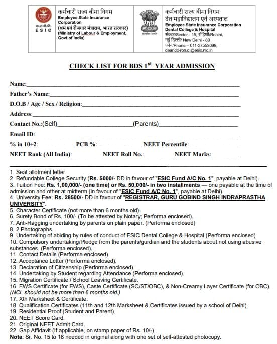 Admission to the dentistry program at Esic Dental and Medical Colleges is based on high NEET exam scores, followed by an application to Guru Gobind Singh Indraprastha University. Students must be under 25 and have at least 60% in their 12th exams. The college hosts around 250 students across all years, offering a structured examination system with regular assessments. Annual fees range from 75,000 to 1,20,000 INR, with additional costs including a 22,000 INR security fee and a 25,000 INR university fee.