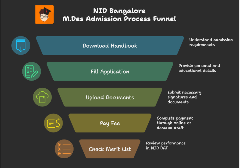 NID Bangalore offers five specializations under its M.Des program at the postgraduate level. Aspiring students require a bachelor's degree in any discipline or a full-time diploma in Design/Fine Arts/Applied Arts/ Architecture to apply for admission to M.Des at NID Bangalore. Admission to M.Des at NID Bangalore is based on the aggregate merit scored by the candidates in NID DAT (Prelims + Mains). Here are the key details about NID Bangalore M.Des Admission 2025: