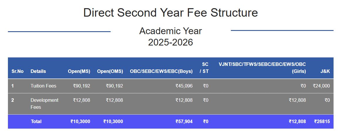 | Fees (2025 - 2026) | Year 1 (in INR) | Year 2 (in INR) | Year 3 (in INR) |