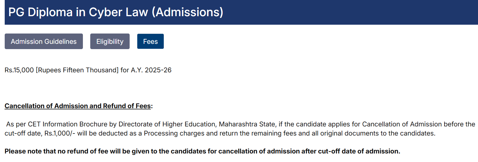 SVKM's Pravin Gandhi College of Law Mumbai PG Diploma Cyber Law and Information Technology fees 2025 is ₹ 15,000 for the entire course duration.