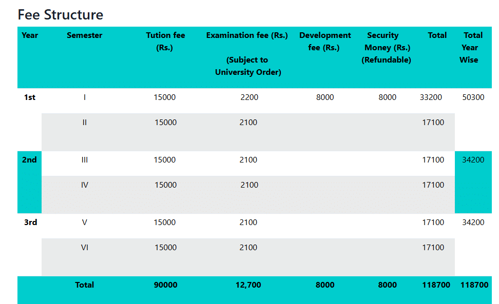 - This includes a total tuition fee of ₹ 90,000, Caution Fees of ₹ 8,000, Other Fees of ₹ 8,000.