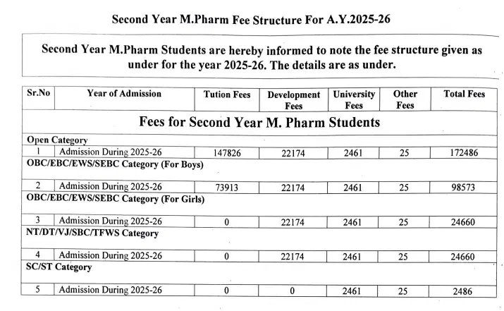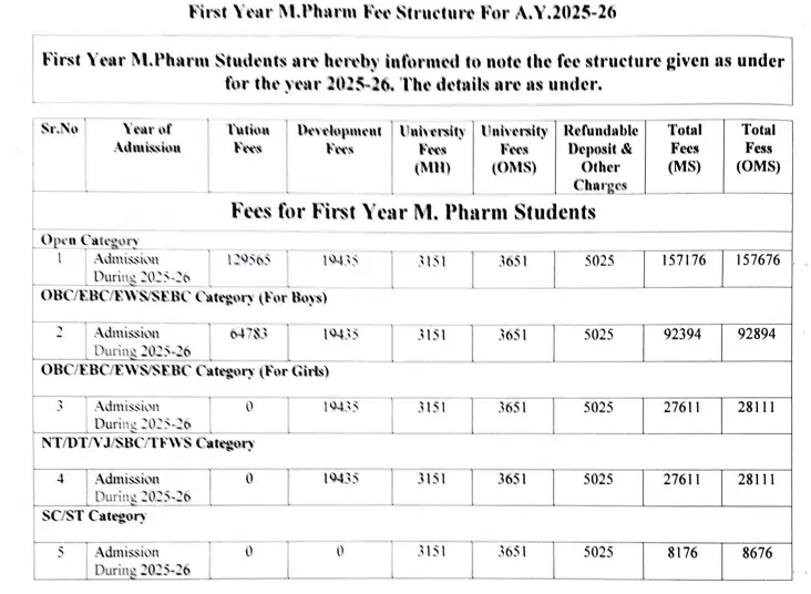 Sinhgad College of Pharmacy Vadgaon M.Pharm Pharmaceutical Quality Assurance fees in first year is ₹ 1.57 Lakhs. The detailed fees is mentioned below.Sinhgad College of Pharmacy Vadgaon Hostel Fee is ₹ 51,000.