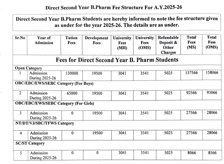Sinhgad College of Pharmacy Vadgaon B.Pharma {Lateral} fees in first year is ₹ 1.58 Lakhs. The detailed fees is mentioned below.Sinhgad College of Pharmacy Vadgaon Hostel Fee is ₹ 51,000.