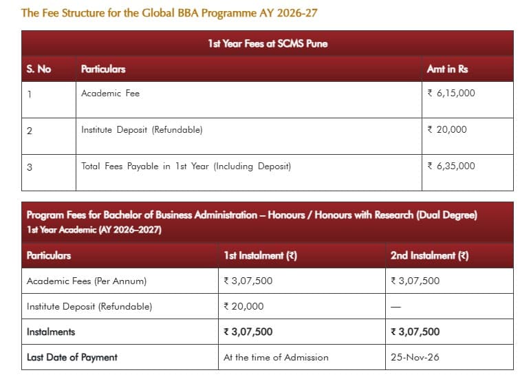 Earlier, BBA Global Business fees at Symbiosis Centre for Management Studies Pune was ₹ 23.6 Lakhs (in 2025) for the entire course duration. This shows a fee increase of ₹ 67.35 Lakhs over the year.