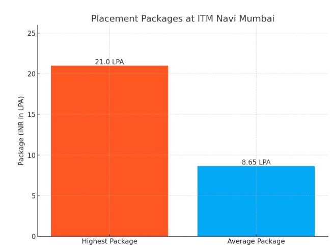 The highest placement package of ITM Navi Mumbai is INR 21 LPA, and the average package is INR 8.65 LPA. The top recruiters for the institute are Deloitte, ICICI Bank, PwC, HDFC Bank, Accenture, NIIT, Netflix, OLA, OYO, IBM, Genpact, KPMG Global Services, Emami, Dabur, Colgate Palmolive, MakeMyTrip, MRF, Polycab, TVS, and many more.