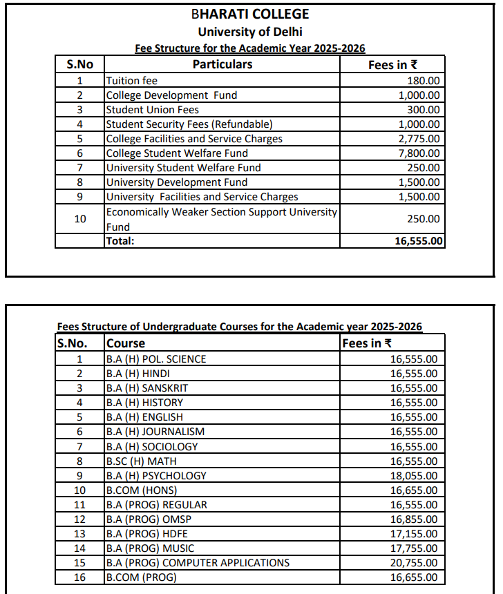 Bharati College B.Com fees 2025 is INR 47,965 for the entire course duration. This includes a total tuition fee of INR 540, Caution Fees of INR 1,000, Other Fees of INR 46,425. Below is the detailed fee information: