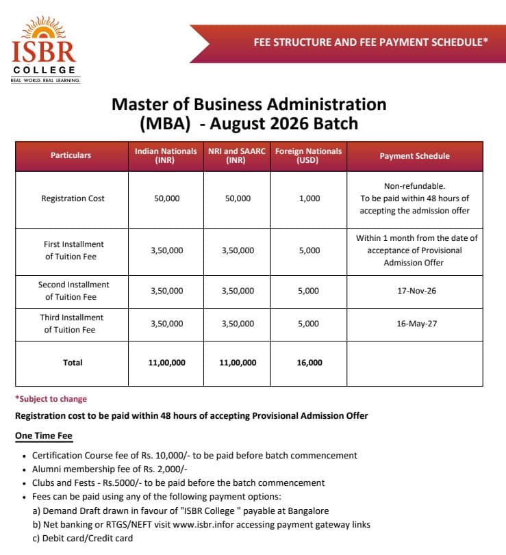 Find detailed ISBR College Bangalore MBA fees, eligibility, admission dates, cutoff and ranking below.
