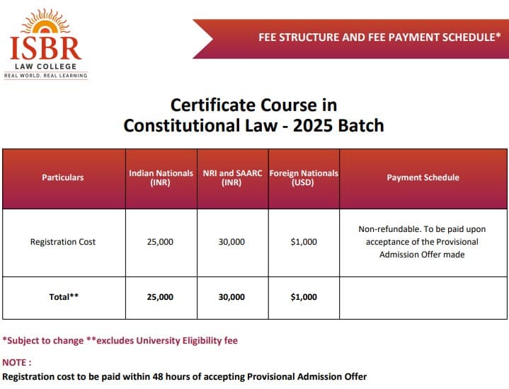 ISBR College Bangalore Certification Constitutional Law fees 2025 is ₹ 1.35 Lakhs for the entire course duration.