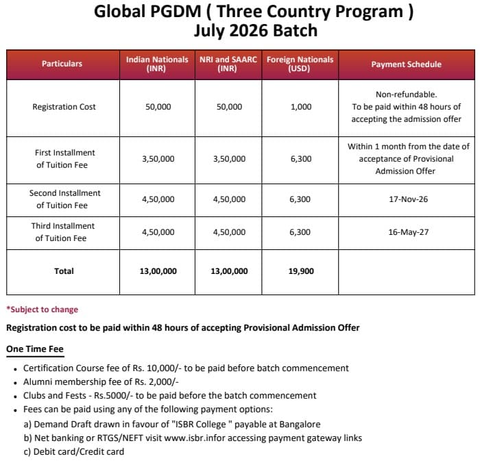 PGDM Global Fees at ISBR College Bangalore covers a range of expenses, including tuition fee, course materials, and access to campus facilities.