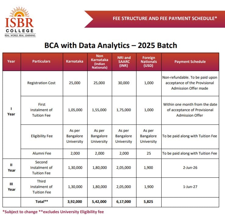 Earlier, BCA Data Analytics fees at ISBR College Bangalore was ₹ 3.27 Lakhs (in 2024) for the entire course duration. This shows a fee increase of ₹ 7.75 Lakhs over the year.