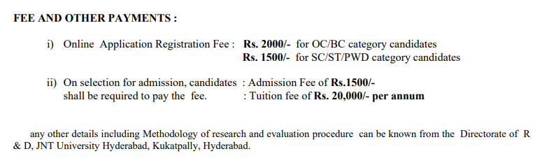 JNTUH, School of Management Studies Hyderabad Ph.D Management Studies Fee has not been released yet. For reference you can check the previous year academic fees in the section below.