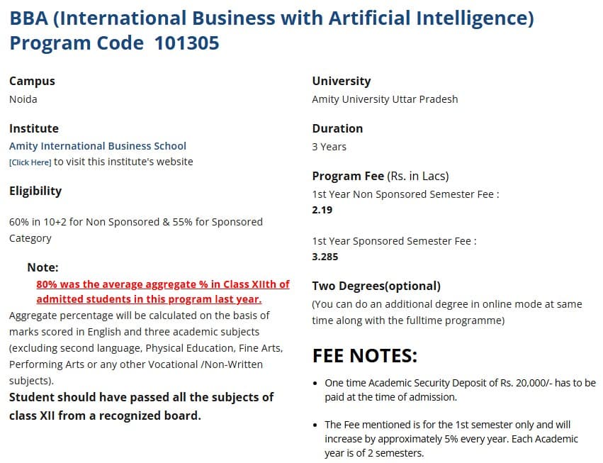 Earlier, BBA International Business with Artificial Intelligence fees at Amity International Business School Noida was ₹ 13.2 Lakhs (in 2020) for the entire course duration. This shows a fee increase of ₹ 14,000 over the year.