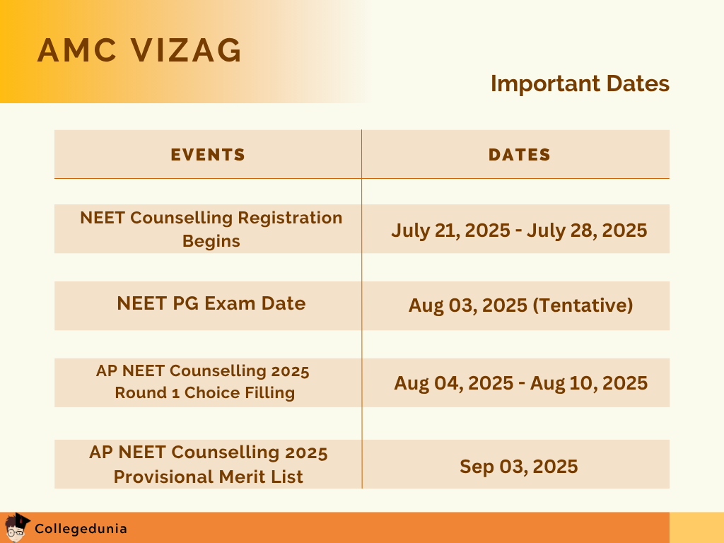 MBBS & MD are offered as flagship programs at AMC Vizag. For admission to the MBBS program, candidates must have passed 10+2 in Physics, Chemistry & Biology with at least 50% marks. Students also need to appear for the NEET UG entrance exam, followed by the counselling process conducted by the Directorate General of Health Services (DGHS) for All India Quota & NTRUHS for State Quota. Candidates need to register on the respective official website for counselling. NEET Round 1 counselling registration begins on July 21, 2025, and AP NEET Counselling 2025 Round 1 Choice Filling registration is expected to be held from August 04, 2025, to August 10, 2025.