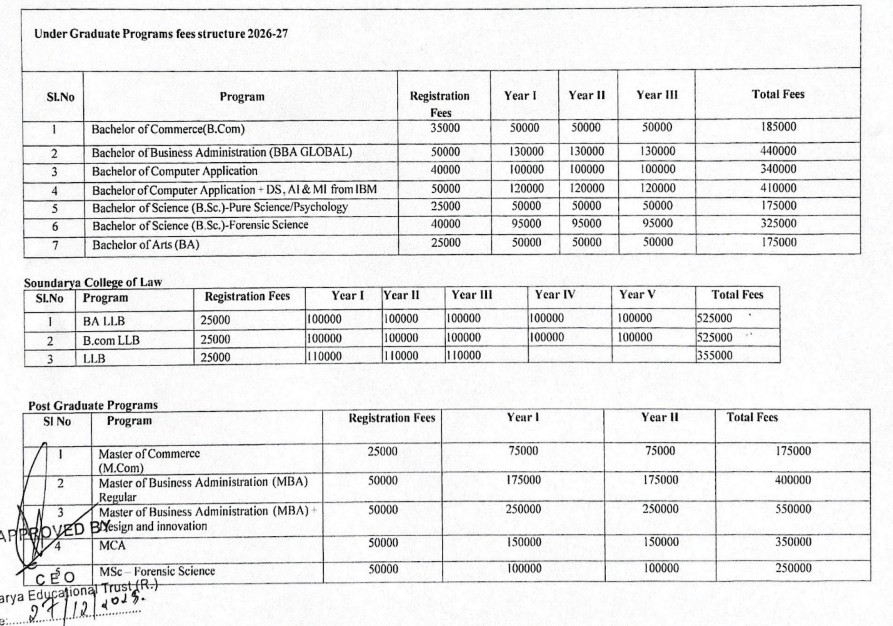Earlier, MBA fees at Soundarya Institute of Management and Science Bangalore was ₹ 4 Lakhs (in 2025) for the entire course duration. This shows that the fee has remained unchanged since 2025.
