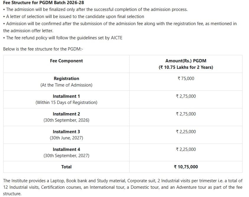 - The total fees for PGDM Human Resource Management is ₹ 10.75 Lakhs.