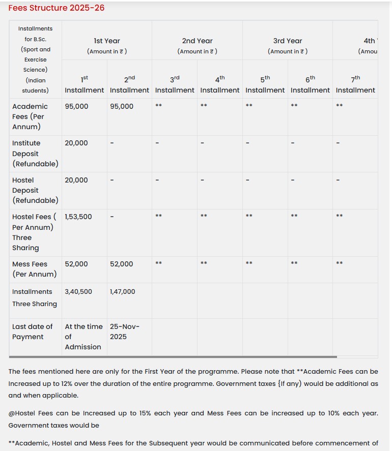 Earlier, B.Sc {Hons.} Sports & Exercise Sciences fees at Symbiosis School of Sports Sciences Pune was ₹ 11.6 Lakhs (in 2024) for the entire course duration. This shows a fee decrease of ₹ 3.8 Lakhs over the year.