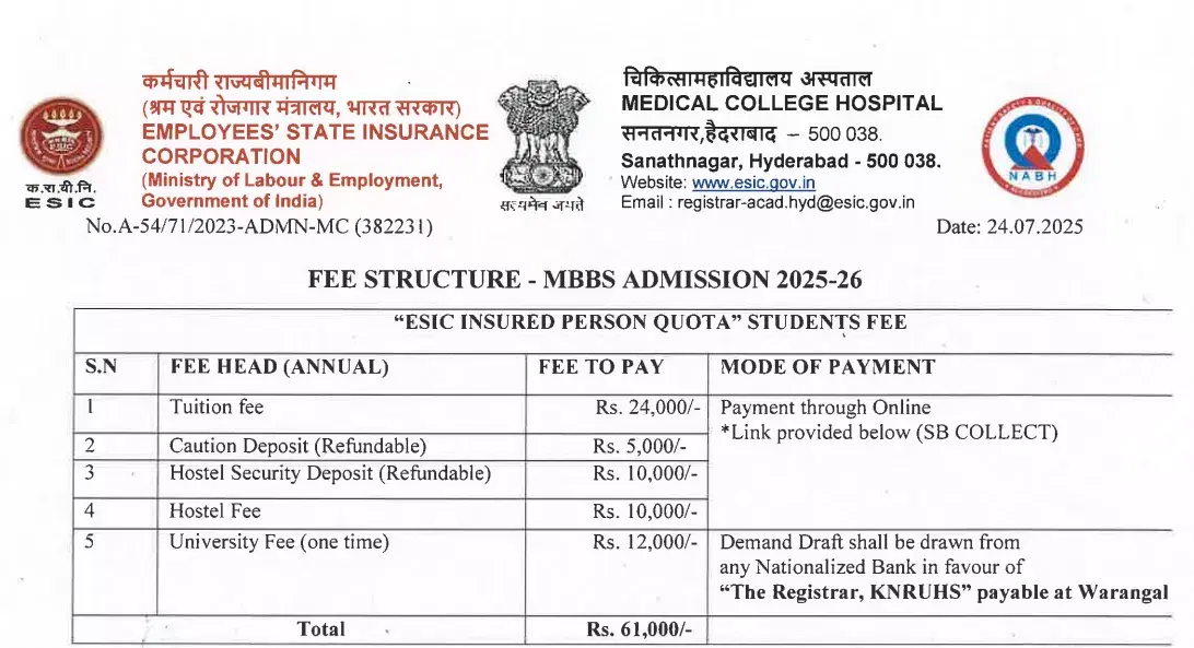 10,000 to 40,000 per month. Approximately 95% of graduates secure placements in hospitals, with opportunities for specialization through NEET PG. Placement support is offered, though not guaranteed, with average salaries post-placement starting at Rs. 20,000 monthly. Scholarships for deserving students include state and central government schemes. The fee structure varies by admission quota: All India Quota (AIQ) is Rs. 1,00,000 per year, State Quota is Rs. 60,000 per year, and IP Quota (ESIC cardholders) is Rs.