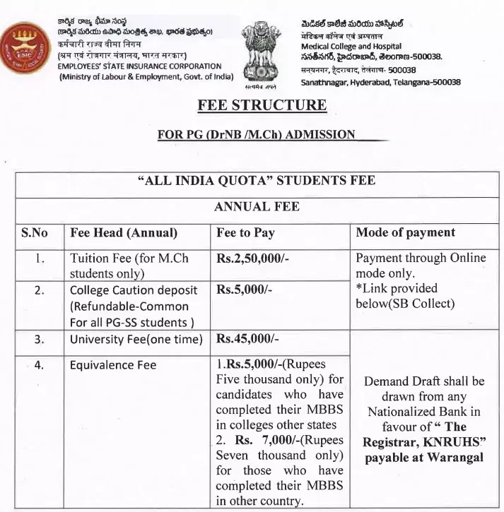 Earlier, M.Ch Neuro Surgery fees at ESIC Hyderabad was ₹ 8.05 Lakhs (in 2024) for the entire course duration. This shows that the fee has remained unchanged since 2024.