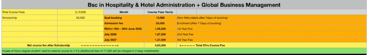 During the FIFA World Cup 2023, students interned with W Doha Qatar in the Culinary Department. The entire course fee is approximately 5 lakhs, which reduces to about 3.5 lakhs after a 50,000 scholarship. An additional refundable caution fee of 8,000 is also charged. Fees are fixed and communicated in advance, but no specific college scholarships are available; students can apply for the National Scholarship Program (NSP). The campus consists of a single 10-floor building.