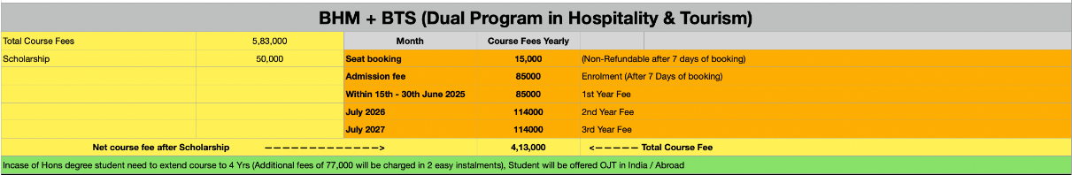 The college offers a Bachelor of Hotel Management and Bachelor of Tourism Studies (BHM+BTS) course over three years with an annual fee of approximately 135,000 INR, amounting to a total cost of around 400,000 INR, which is competitive compared to other institutions. The faculty is well-qualified and experienced, prioritizing comprehensive education through regular seminars and workshops. The evaluation system comprises six exams over three years, with both practical and written components contributing to final scores.
