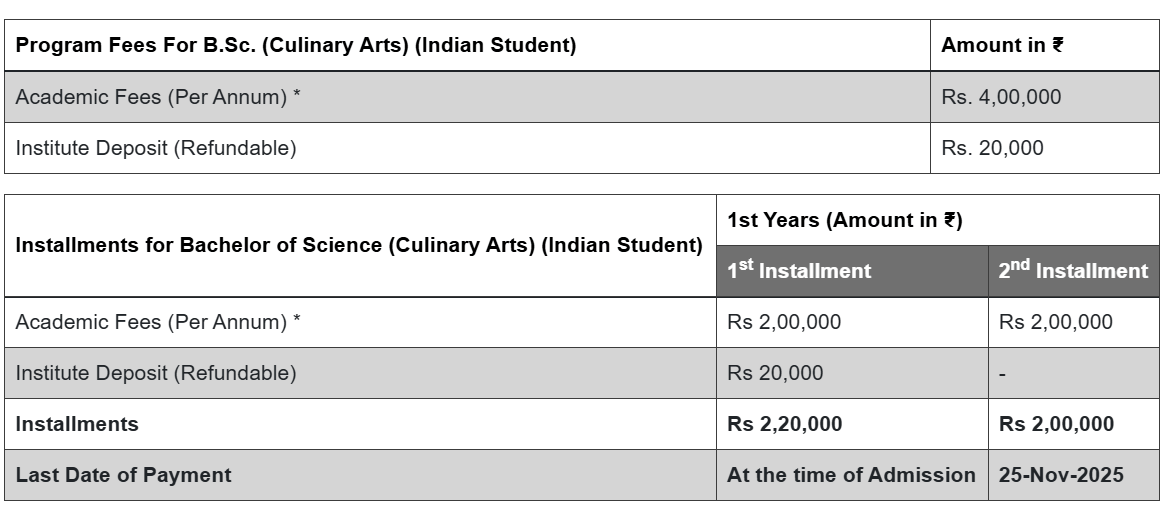 Earlier, B.Sc Culinary Arts fees at Symbiosis School of Culinary Arts & Nutritional Sciences was ₹ 12 Lakhs (in 2024) for the entire course duration. This shows a fee increase of ₹ 20,000 over the year.