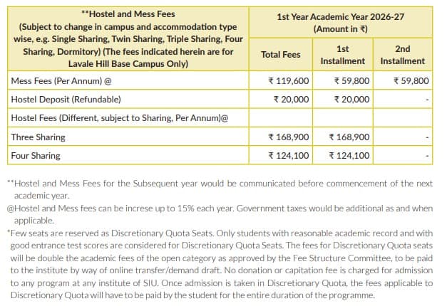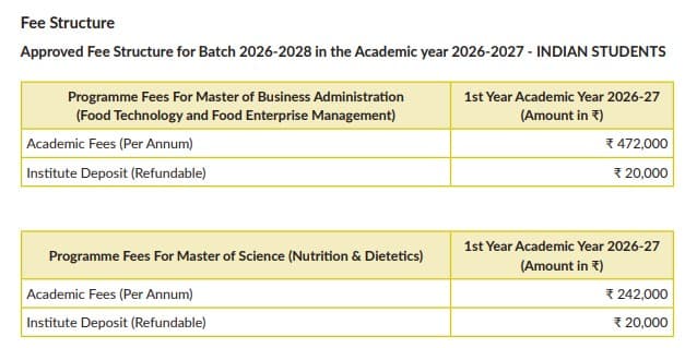 Earlier, M.Sc Nutrition and Dietetics fees at Symbiosis School of Culinary Arts & Nutritional Sciences was ₹ 5.04 Lakhs (in 2025) for the entire course duration. This shows a fee increase of ₹ 5.97 Lakhs over the year.