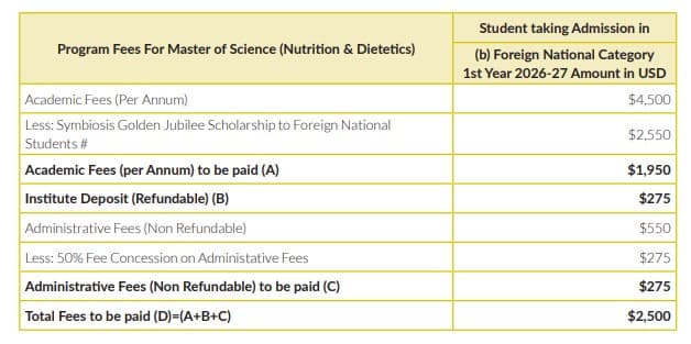 For students applying under the NRI quota for admission, the total course fee for M.Sc Nutrition and Dietetics at Symbiosis School of Culinary Arts & Nutritional Sciences is ₹ 15.12 Lakhs.