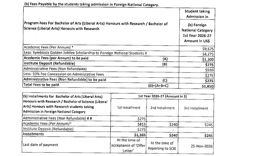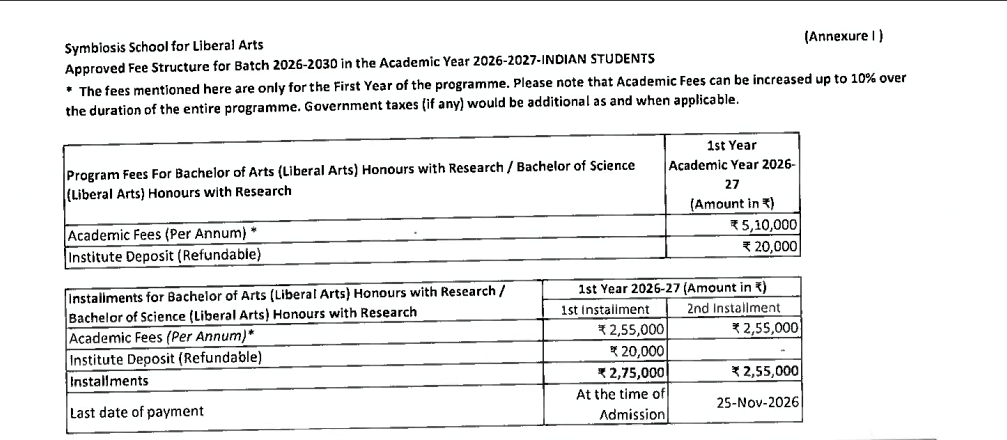 Earlier, BA {Hons.} Liberal Arts fees at Symbiosis School for Liberal Arts Pune was ₹ 19.8 Lakhs (in 2025) for the entire course duration. This shows a fee increase of ₹ 80,000 over the year.