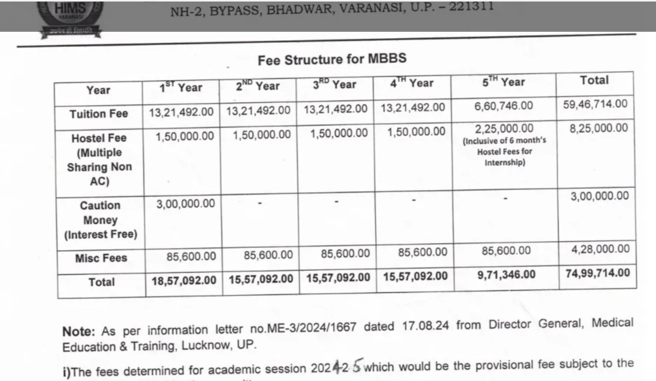 The fee for the MBBS course is around Rs. 14 lakh annually, inclusive of tuition, hostel, and other fees. The first year costs approximately Rs. 18.31 lakh due to a refundable Rs. 5 lakh security deposit, totaling about Rs. 69.4 lakh over five years. Hostel accommodation is mandatory, costing Rs. 3 lakh annually, with exam fees up to Rs. 15,000 per subject. Scholarships are available based on merit and category, although the college doesn’t provide its own.