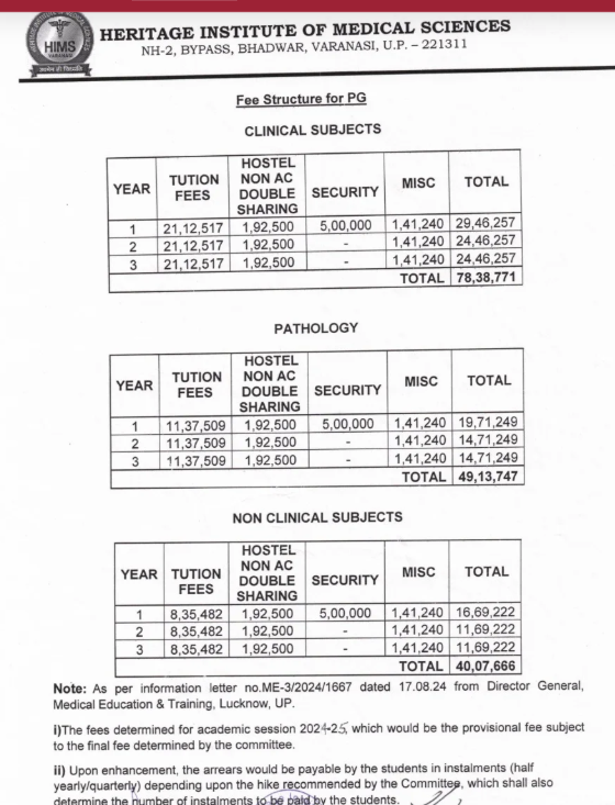 HIMS Varansi M.S Ophthalmology fees in first year is ₹ 27.54 Lakhs. The detailed fees is mentioned below.HIMS Varansi Hostel Fee is ₹ 1.5 Lakhs to 2.25 Lakhs.