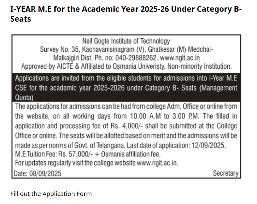 Admissions to ME Computer Science And Engineering at NGIT are primarily based on TS-PGECET. Candidates must have completed Graduation to be eligible for admission. The overall TS-PGECET cutoff for the ME Computer Science And Engineering program is 127 - 5694 across all categories. Check NGIT Admission