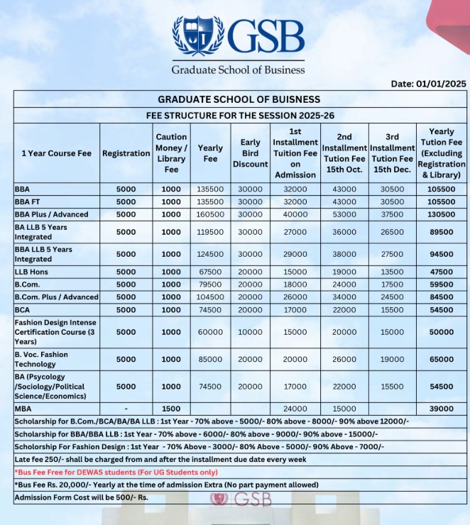 06 Sep, 2025 Graduate School of Business Indore has released the Fee Structure 2025-26 for various B.Voc Fashion Design programs. The Academic Fee is ₹ 2.55 Lakhs.